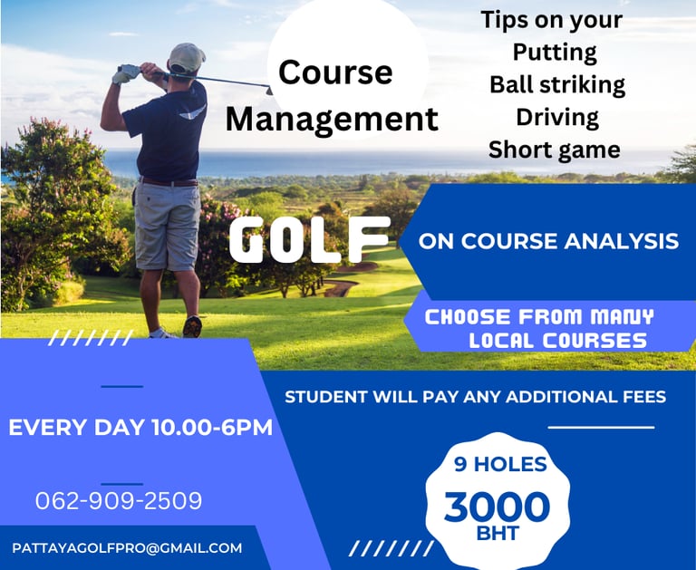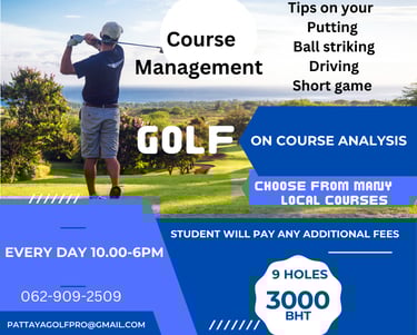 Chipping around the Green from various lies. Short chips with different clubs. Bump and Run - High and Low chips. Chipping over a bunker and bunker play. Thinking about what type of shot to play and more Price from 1300bht each for 2 people to 800bht each for 4-6 people on our world class facility